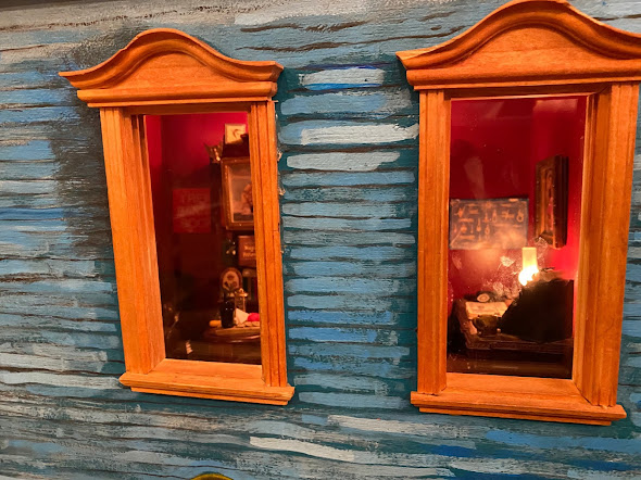A little doll house all lit up inside the counter at the bookstore.